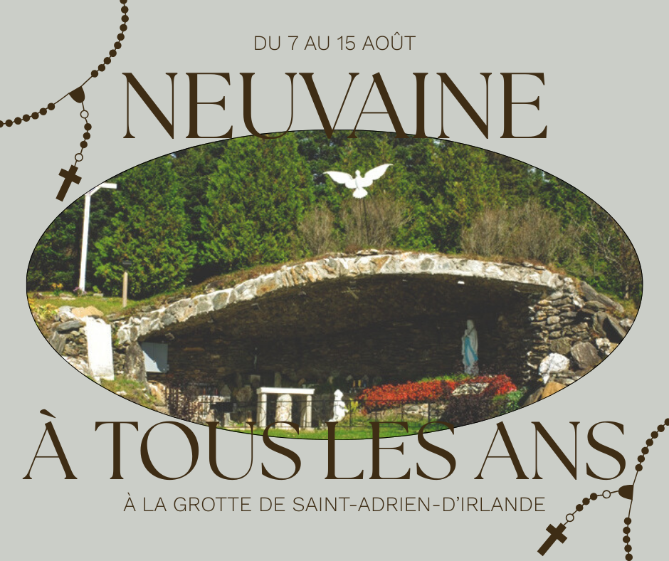 En 1958, un comité s’organisa rapidement et chaque paroissien voulait faire sa part. Les plans sont faits gratuitement pour la Sainte Vierge par un jeune homme de Thetford qui terminait ses études en architecture, monsieur Paul-André Caouette. Une autre personne offrit de payer la statue. Chaque paroissien apporta une pierre de son terrain. L’endroit fut choisi : au flanc de la montagne qui domine la paroisse de St-Adrien-d'Irlande, près de l’église, où coulait un filet d’eau. Le travail s’est effectué rapidement en équipes et bénévolement. Bientôt, la grotte s’élevait vers le ciel. On la voulait solide et durable, bâtie sur le roc. L’infrastructure était en fer. La toiture a demandé cinquante tonnes de pierre; on dit que le plafond est unique au Canada et capable de durer des siècles.