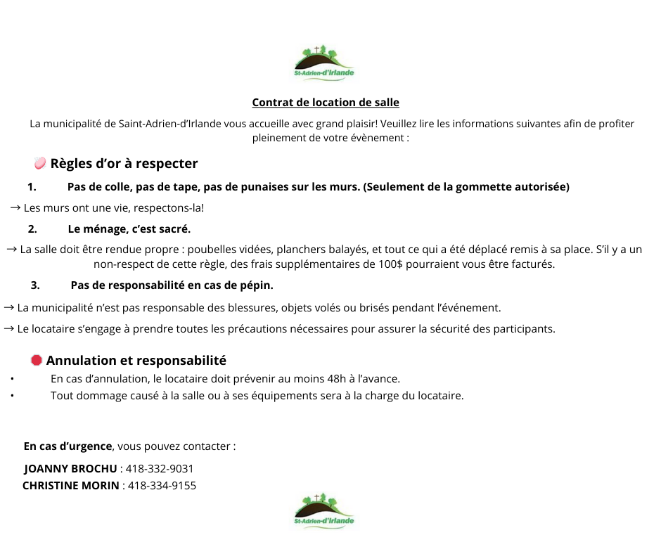 Prix de location : 175$ (payable en argent comptant (au bureau municipal lors des heures d'ouverture) ou par virement interac)